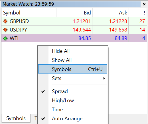 • Double-click the quote window at the top left corner of the platform and select “Symbols.”