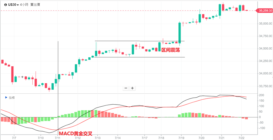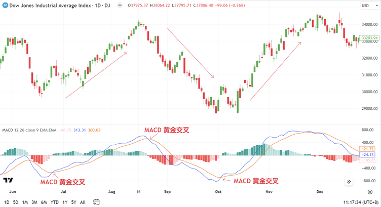 下方道琼指数(US30)的日图走势中,包含了两个典型的MACD黄金交叉和死亡交叉的案例。在三个交叉信号中,都提供了交易者准确的入场位置。