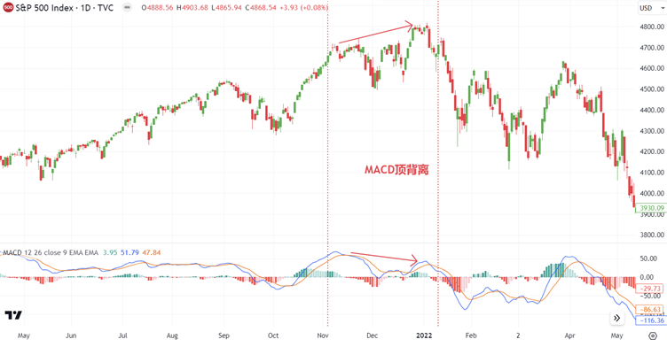 在上图标普500指数的日图中,就出现了一个典型的顶背离。在MACD顶背离的出现后,处在上涨趋势中的标普500指数之后则开始出现反转,形成下跌趋势。