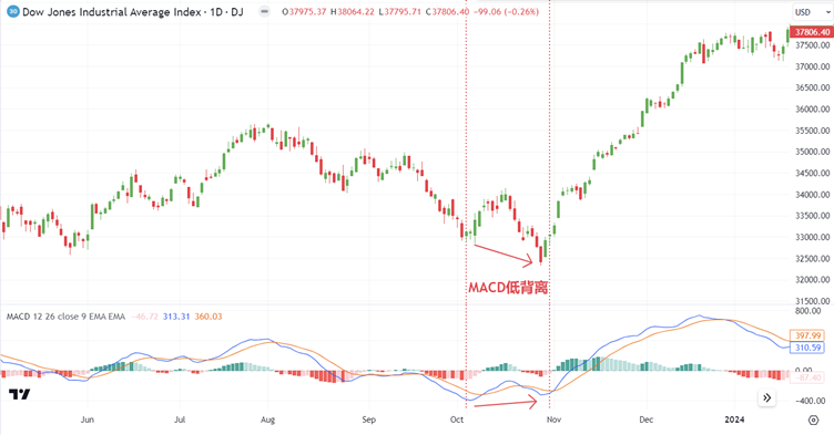 以上图的道琼指数日图为例,当道指创下新低后,MACD线(蓝线)则没有跟随创下新低。在MACD底背离出现后,道指下跌趋势开始转为上涨趋势,形成一个有效的趋势反转信号。