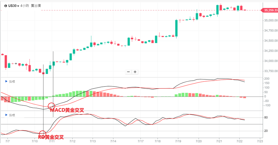 来看一个MACD KD配合的示例 (KD MACD 黄金交叉)–下图是在前一章节的道指图表中添加了KD指标。可以看到,KD指标的黄金交叉信号,出现时间不仅早于MACD黄金交叉,并且几乎是在价格最低点便发出信号。